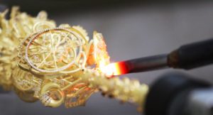 Una vez finalizados los pasos de fundición, el resultado es un árbol de joyas de metales preciosos. El árbol de la joyería va al joyero de banco que luego separa cada componente de la joyería de la fuente principal cortando la fuente con alicates o una sierra.
